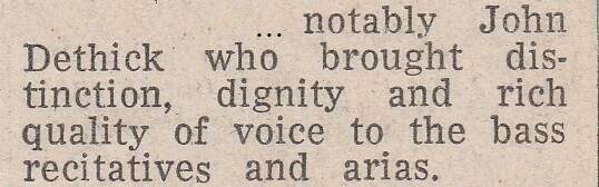 Despite acclaimed success John Dethick was never invited to make a recording by any record company. The only disc he made was for Ambassador College, whose main base was at Pasadena, California, during a performance of Messiah at Watford Town Hall in 1965. Below is part of the record sleeve: